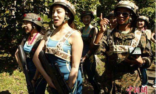 正在海南三亞參加美麗之冠2014世界休閑小姐大賽中國年度總決賽的佳麗,身穿迷彩手持激光槍體驗真人CS訓(xùn)練。北京時間12月28日,正在海南三亞參加美麗之冠2014世界休閑小姐大賽中國年度總決賽的佳麗,身穿迷彩服,手持銘恒科技公司生產(chǎn)的真人CS裝備,在熱帶叢林中進行真人CS激光野戰(zhàn),場面激烈,佳麗們個個身手敏捷,巾幗不讓須眉,打出了水平,秀出了風(fēng)彩,體驗真人CS環(huán)節(jié)成為本次美麗之冠2014世界休閑小姐大賽最出彩的一環(huán),中新網(wǎng)等眾多媒體現(xiàn)場追蹤采訪。