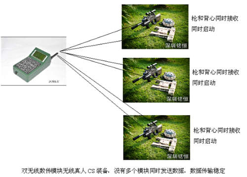 基于以上原理,銘恒在槍里增加了無線數(shù)傳模塊,戰(zhàn)斗開始和戰(zhàn)斗結(jié)束時,槍自已能解碼不必背心轉(zhuǎn)發(fā),不存在多個模塊同時發(fā)數(shù)的情況,完全消除了同頻干擾。還是打個形象的比喻,會場只有一個人說話,所有的人都只是聽,不需要誰來中轉(zhuǎn)傳達(dá),會場很安靜,每個人都可以聽得很清楚了,所以銘恒無線裝備的穩(wěn)定性是很高的,和有線裝備背心接收大遙的數(shù)據(jù)是沒有區(qū)別的,而且銘恒的裝備在進放戰(zhàn)斗后,由于是雙模快接收對方反饋的成績,有糾錯功能,在這績這方面比有線裝備的準(zhǔn)確率還提高的50%。